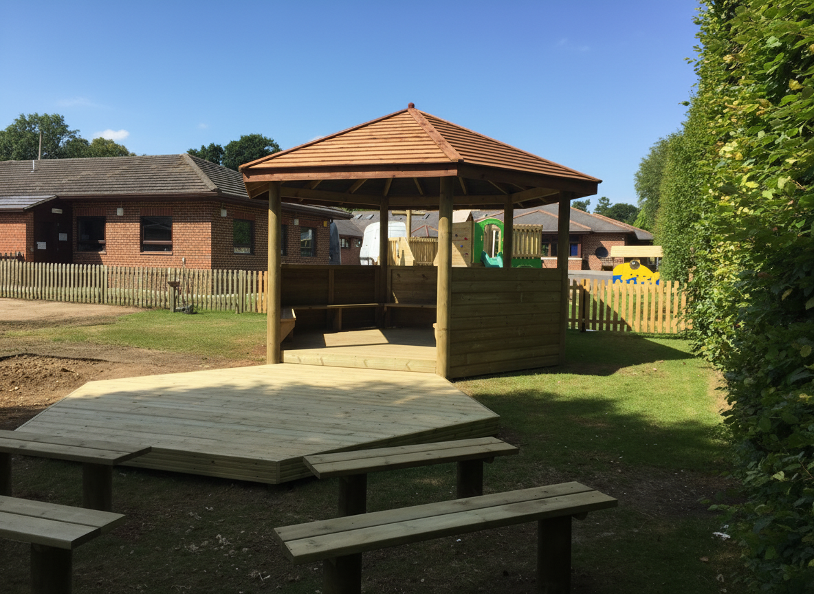 Freestanding hexagonal and rectangular gazebos with pitched roofs, built-in seating and custom sizing. A beautiful, practical outdoor space your school will use every day.